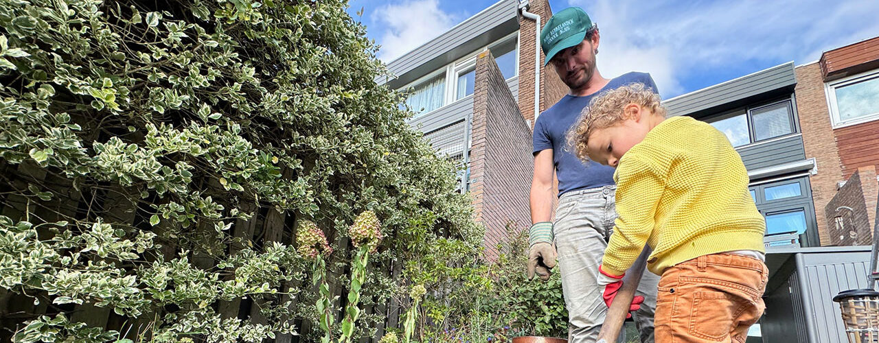 Dit is Manu. Samen met zijn vader Sjoerd wipte hij gisteren maar liefst 10 m² tegels uit de tuin.