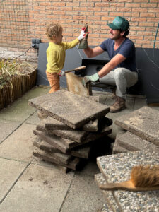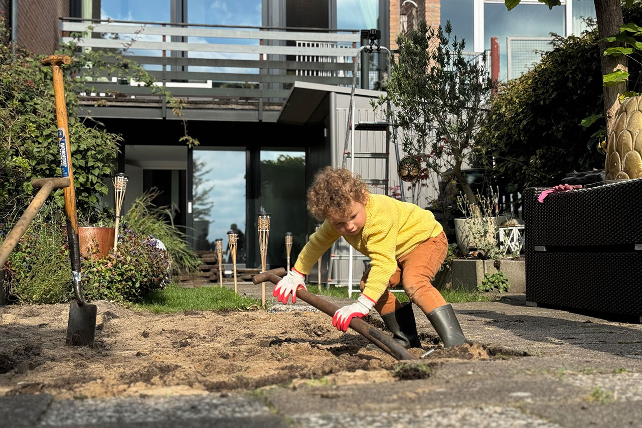 Dit is Manu. Samen met zijn vader Sjoerd wipte hij gisteren maar liefst 10 m² tegels uit de tuin.