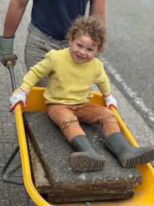 Manu heeft van begin tot eind meegeholpen. Aan het eind was hij wel erg moe en mocht toen mocht hij bij het afvoeren van de tegels lekker meerijden in de kruiwagen met zijn vader.