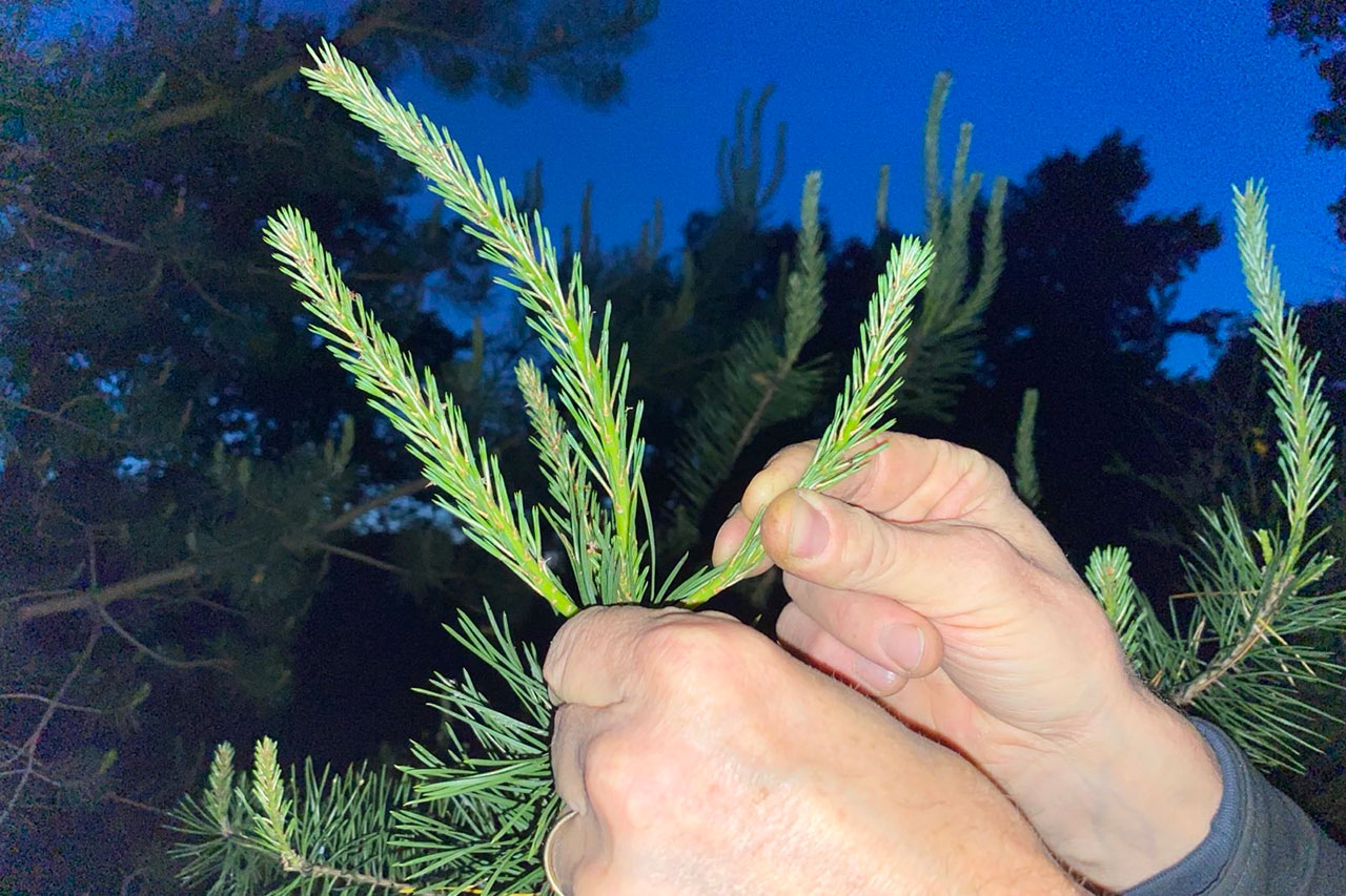 Gijs vervolgt: ‘Gin wordt normaal gemaakt uit stookwijn. Bier heeft een lager alcoholpercentage en er zit hop in. Dat bevat allerlei etherische oliën die er uit moeten. Je moet het wel twee of drie keer stoken wil je mooie schone alcohol overhouden. Daarna ga je er smaken aan toevoegen, zoals jeneverbes en korianderzaad. Wij wilden ook iets lokaals vinden en dat werden heidebloesem en dennentoppen van de Pinus Sylvestris oftewel de Vliegden. Het leuke is dat we die topjes zelf geoogst hebben uit onze Hilversumse achtertuin.’