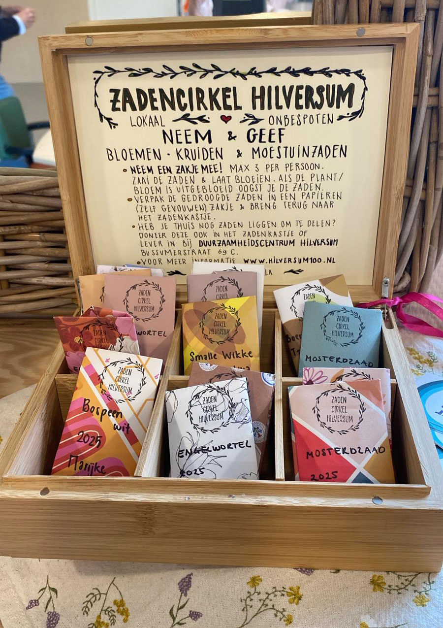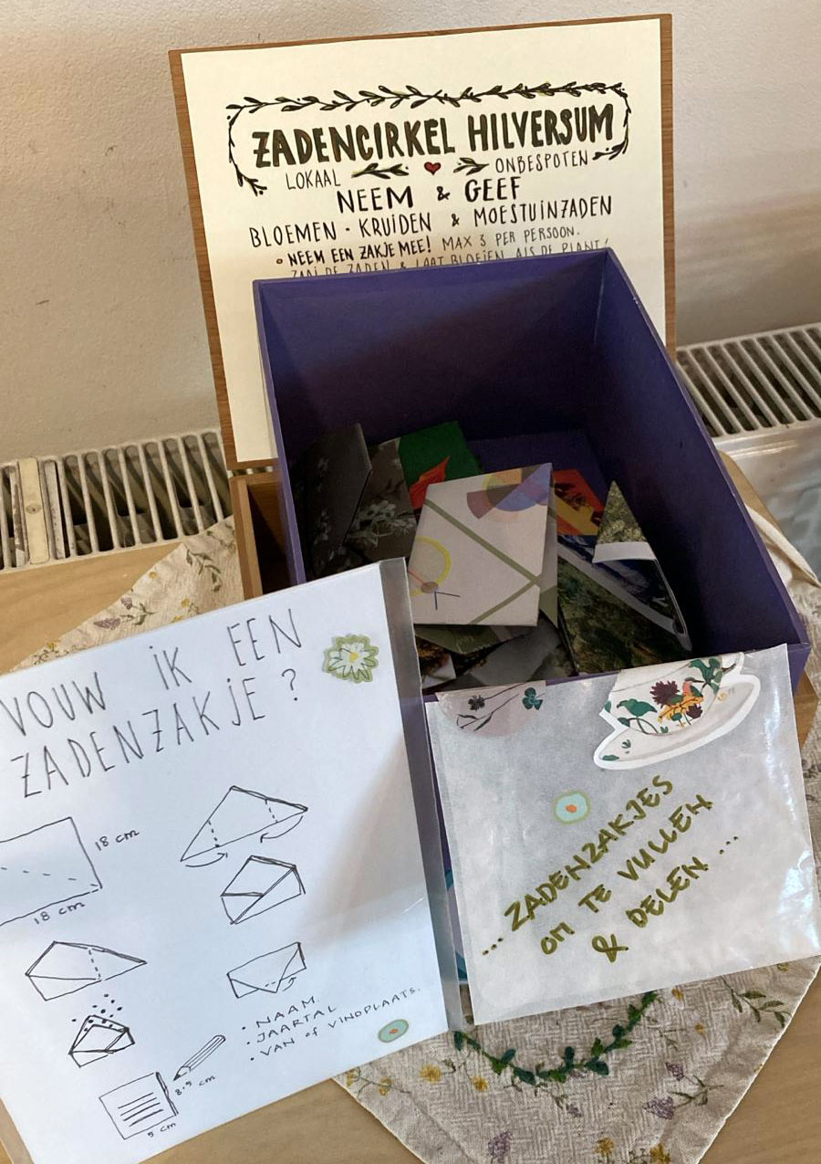 In zelfgevouwen zakjes, bewaard in een theekistje, liggen nu gratis zaden te wachten in wijkcentra door heel Hilversum. In de deksel van elk kistje staat een gebruiksaanwijzing, en er zitten mallen in zodat je zelf zakjes kunt vouwen. Laagdrempeliger kan haast niet.