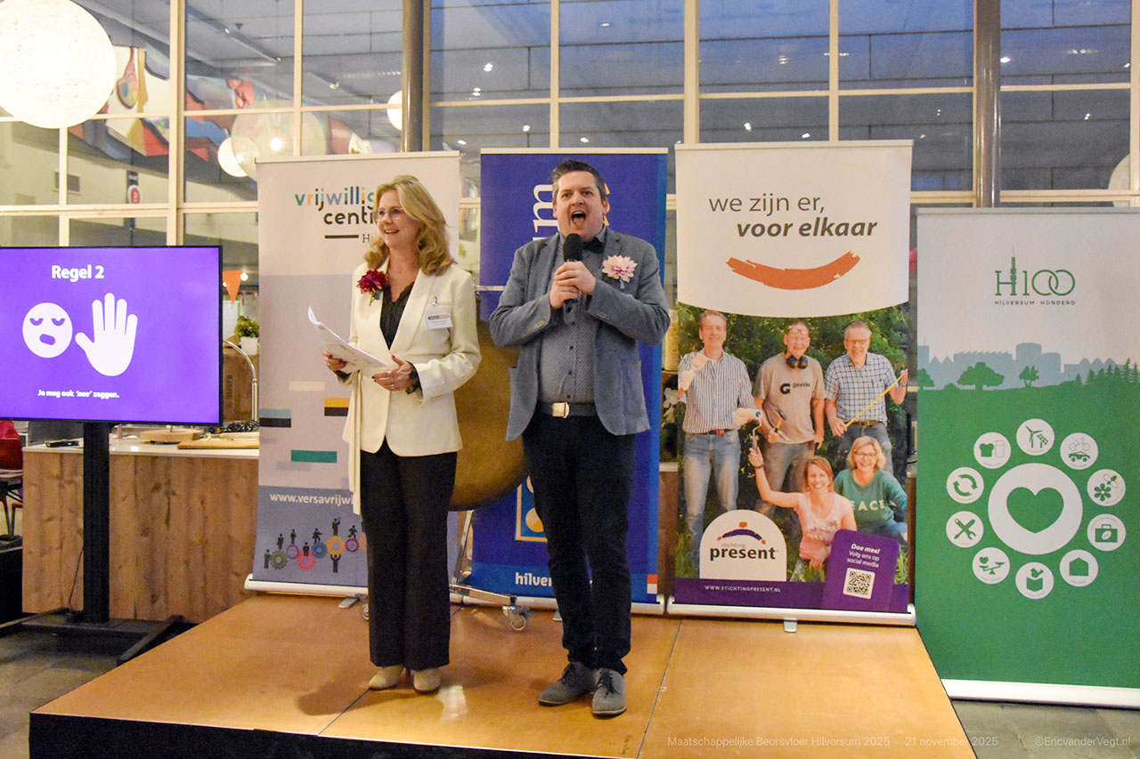 Presentator Robbert Jan Proos gaf, voordat de beurs van start ging, het woord aan wethouder Gerben van Voorden. Gerben deed een oproep aan aan alle ondernemers van Hilversum. “Geef iets van je tijd, inzet van je personeel, of van je kennis en bied dit aan op de beursvloer. Vrijwilligerswerk doen met de mensen uit je bedrijf geeft energie en zorgt voor verbondenheid met die inwoners die wat extra hulp kunnen gebruiken.” Ook wethouder Floris Voorink was aanwezig en had een aanmoedigend praatje. Gerben en Floris luidden samen de gong ten teken dat de beursvloer geopend was.