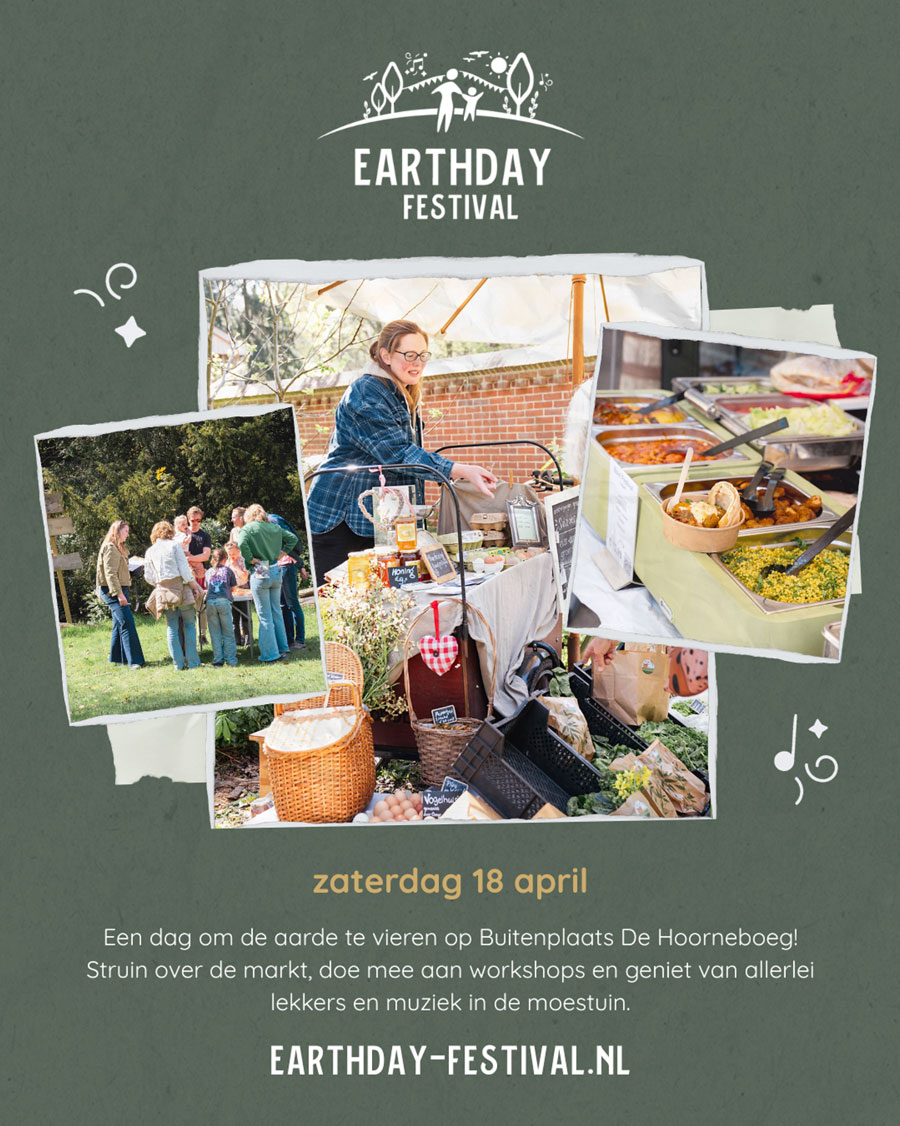 Een dag om de aarde te vieren op Buitenplaats de Hoorneboeg! Struin over de markt, doe mee aan workshops en geniet van allerlei lekkers en muziek in de moestuin.