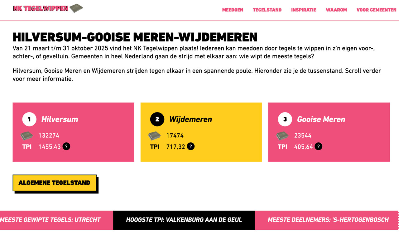 Hilversum behoort tot de koplopers van tegelwippend Nederland. Er deden dit jaar nl. 203 gemeenten mee aan het NK Tegelwippen. Alles bij elkaar opgeteld vervingen al die gemeenten dit jaar maar liefst 5,9 miljoen tegels door groen. Alle cijfers en een mooie nabeschouwing kun je vinden op www.nk-tegelwippen.nl .