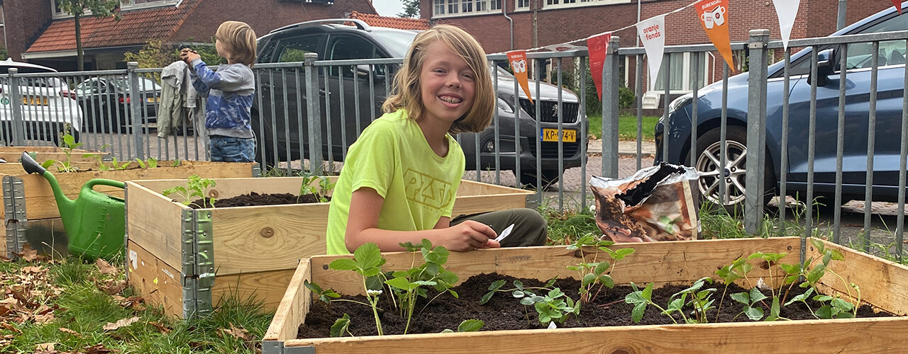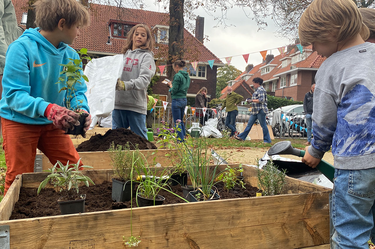 5 Houten bakken werden door de kinderen ingezaaid. De initiatiefnemers – Carola van Gessel en Bart Koelemaij – kregen uit handen van een buurtbewoonster die aan de voet had gestaan aan dit initiatief een welverdiende rozet-medaille opgespeld.