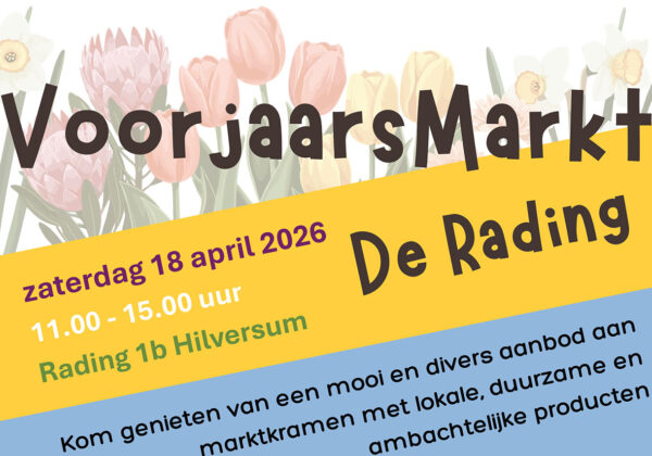 Op zaterdag 18 april vindt op De Rading in Hilversum een gezellige en duurzame voorjaarsmarkt plaats. Op de biologische tuin en terras op de ...