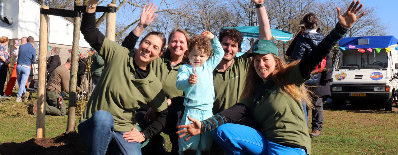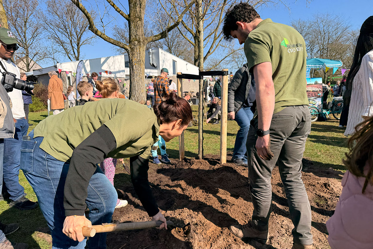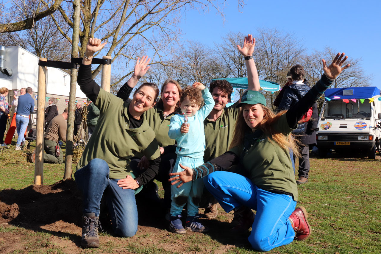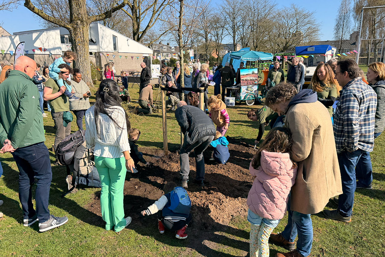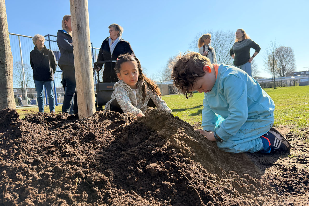 Met vele kleine schepjes maakte het planten van de boom licht werk.