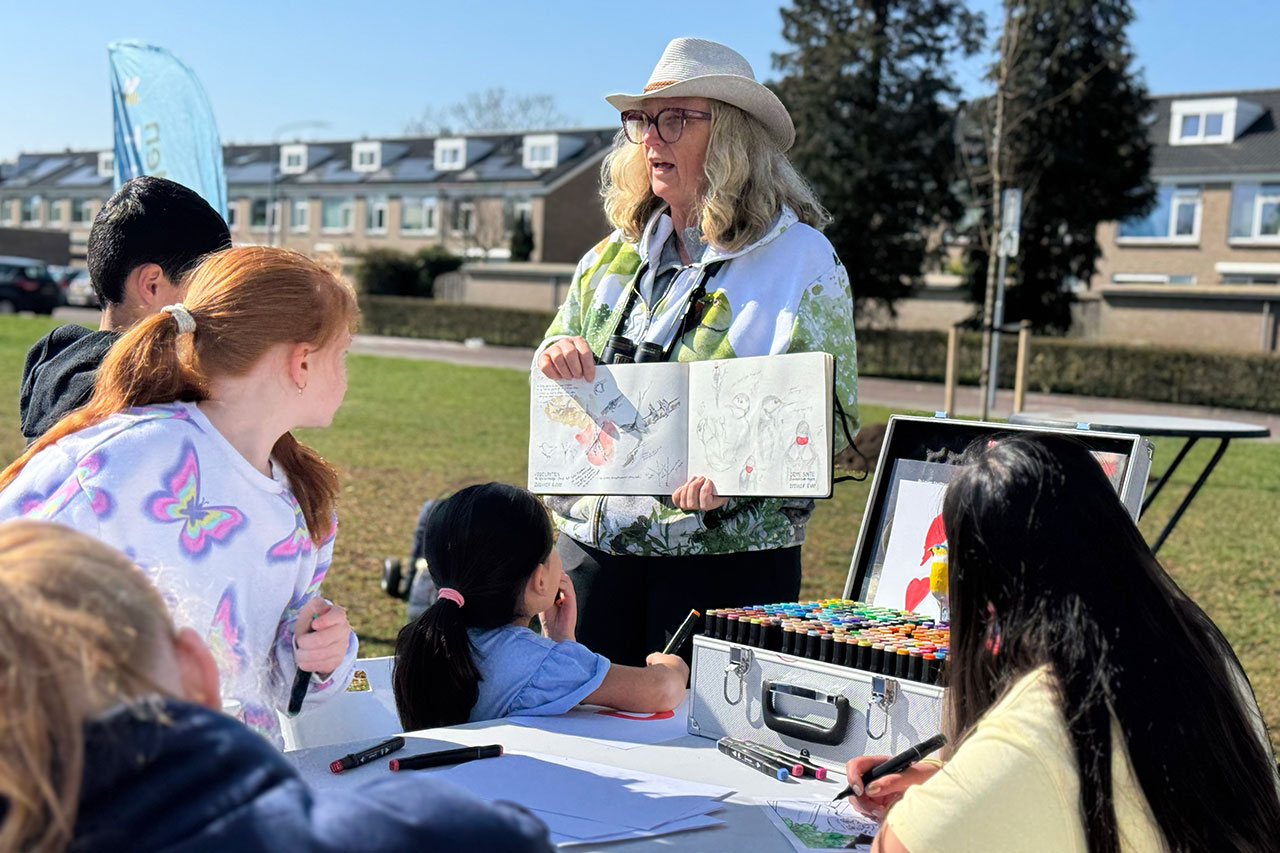 Na een speech van Ilona Hartensveld waarin ze de vele betrokken organisaties bedankte – Versa Welzijn, Hilversum100, Woningbouwcorporatie De Alliantie, Dudok Wonen en vooral Gemeente Hilversum – werd het woord gegeven aan Frank Velthuizen van Vogelbescherming Nederland en initiatiefnemer van de landelijke organisatie ‘Groene Bondgenoten‘.